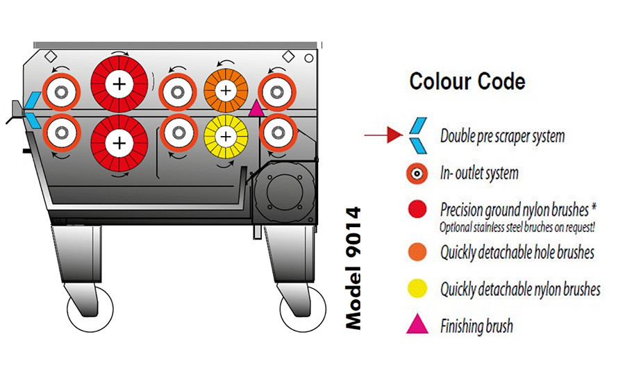 MÁQUINA DE LIMPAR TABULEIROS.MOD: 9014-Para tabuleiros de qualquer tamanho sem ou com 2 abas.-Para tabuleiros lisos e perfurados.Standard- Escovas laterais.- Rolos de entrada e saída.- Extra set de escovas de limpeza- Rolos especiais para tabuleiros perfurados.